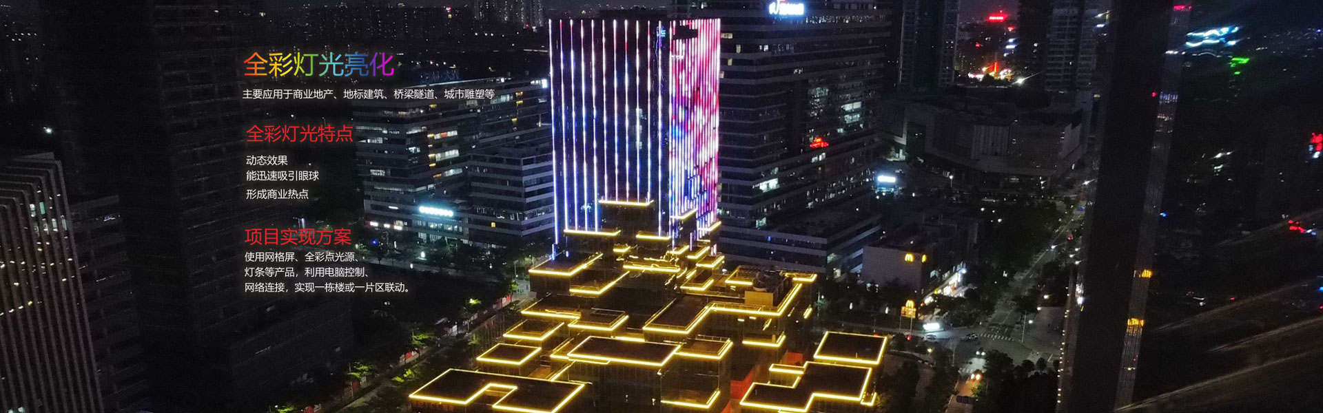 全彩LED燈光是通過安裝帶DMX512控制芯片的燈具,再通過電腦、控制器進(jìn)行編程,使燈光能按程序展現(xiàn)不同效果,常用效果有炫彩、跑馬···
